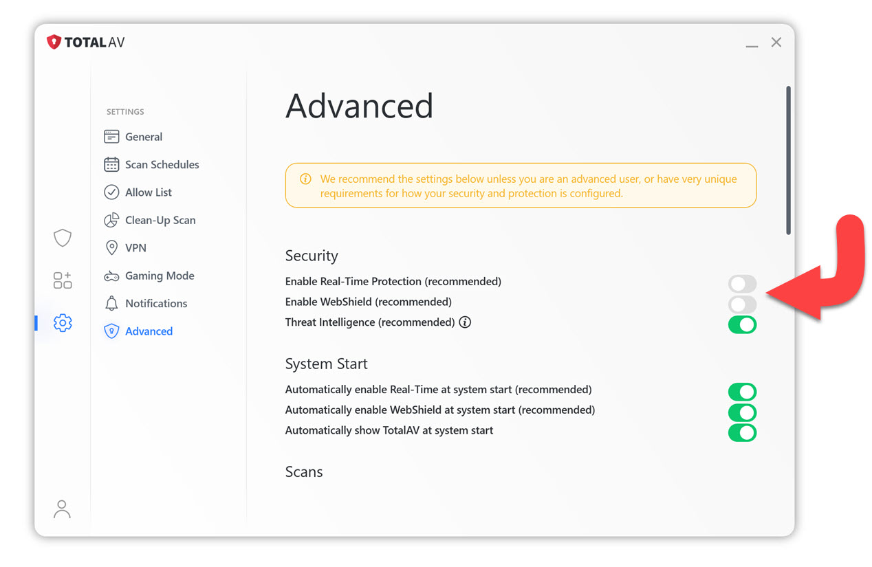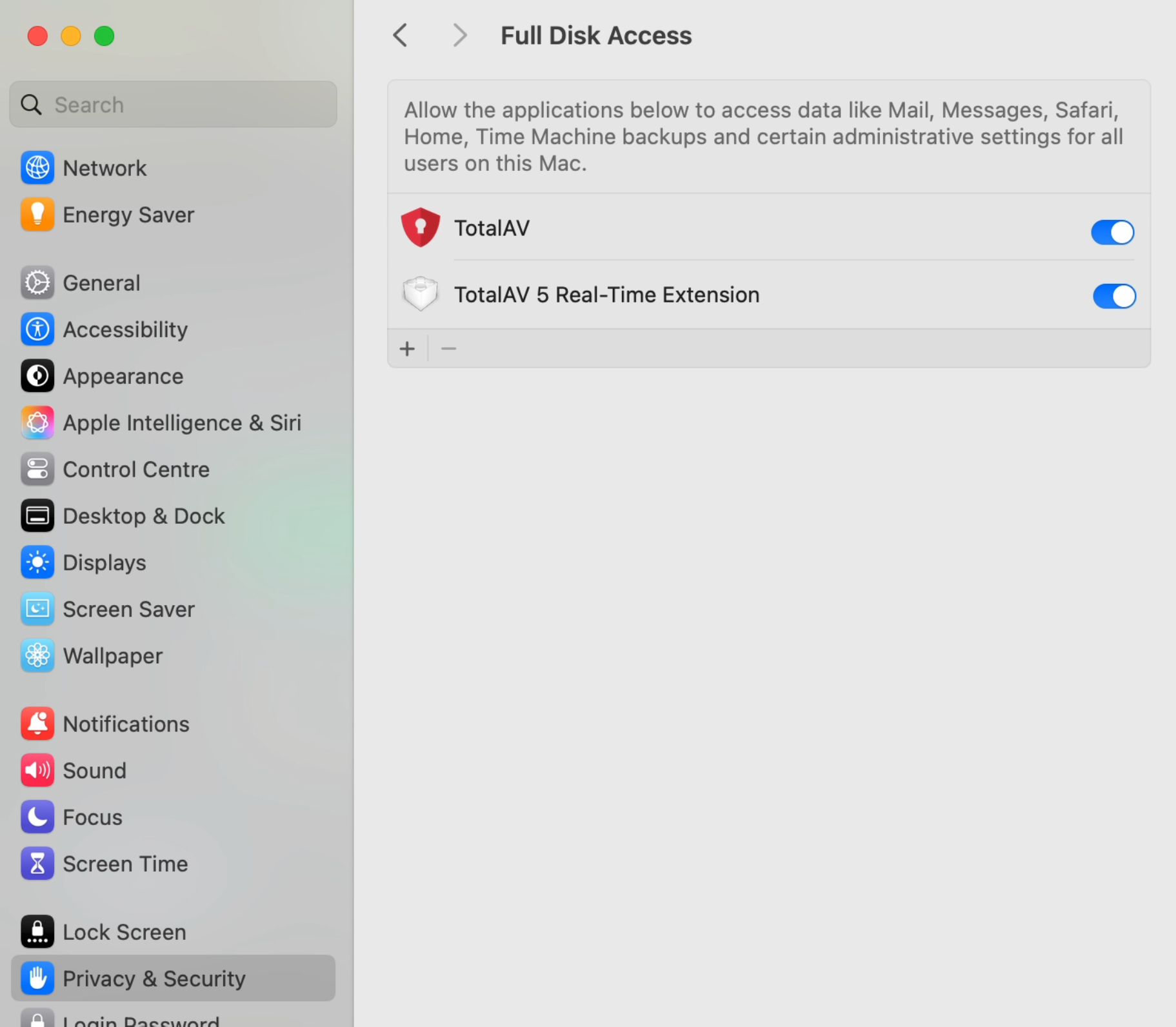 • Aktiverade TotalAV för fullständig diskåtkomst genom att klicka på växlingsknappen.
