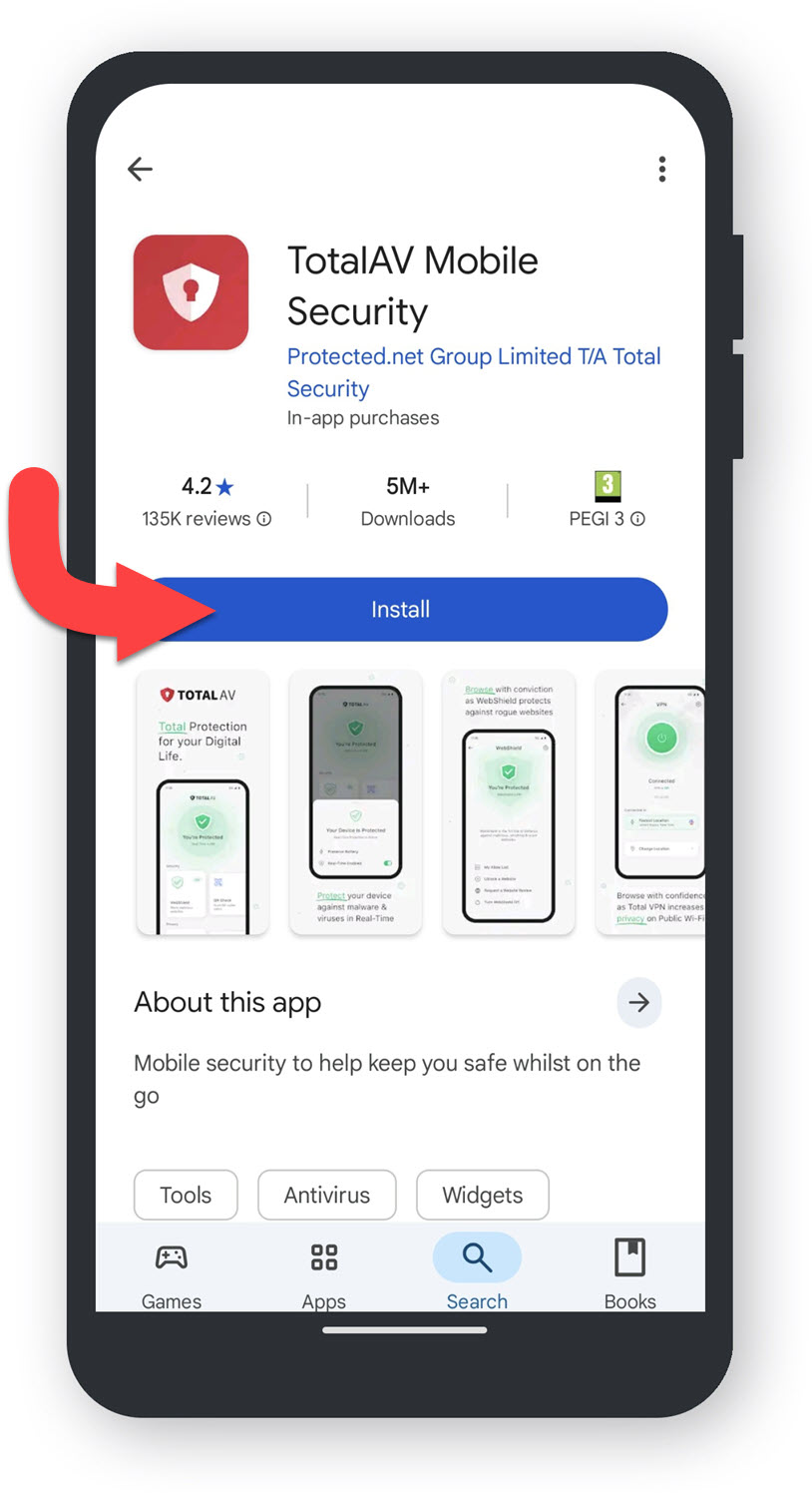 Tryck på Installera på sidan TotalAV Google Play Store.