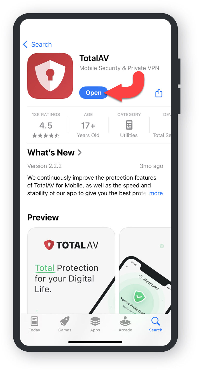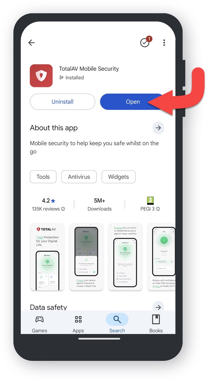 Tryck på Öppna för att öppna TotalAV-applikationen.