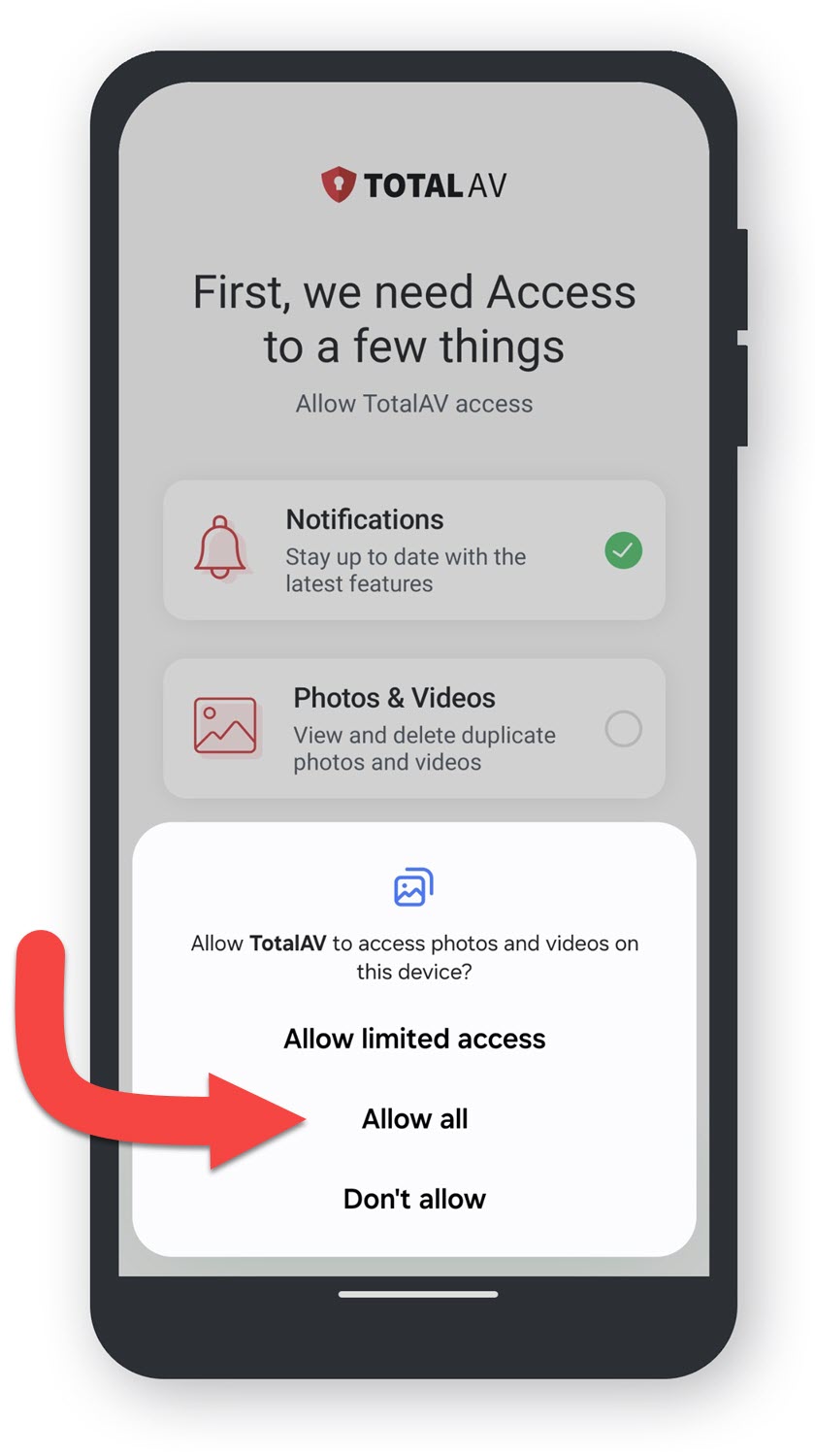 • Tryck på Tillåt alla för att ge TotalAV åtkomst till dina foton och videor. Om du inte vill ge TotalAV all åtkomst trycker du på Tillåt begränsad åtkomst.