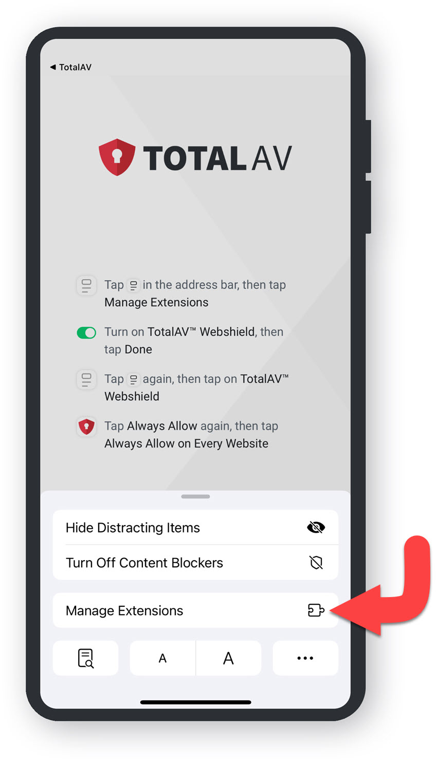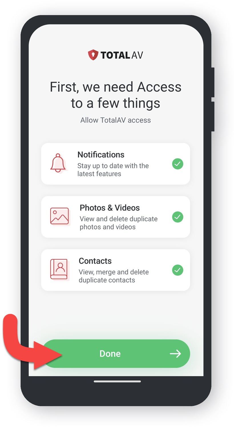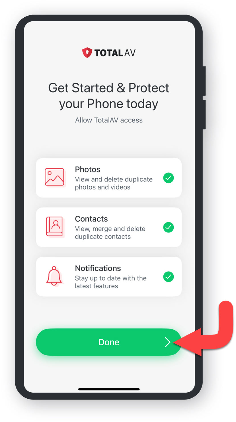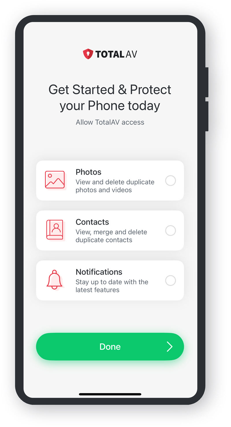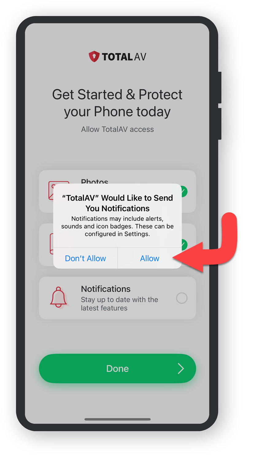 Obs: TotalAV kräver behörigheter på din iPhone eller iPad för att funktioner som rensningsverktyg och aviseringar ska fungera korrekt.