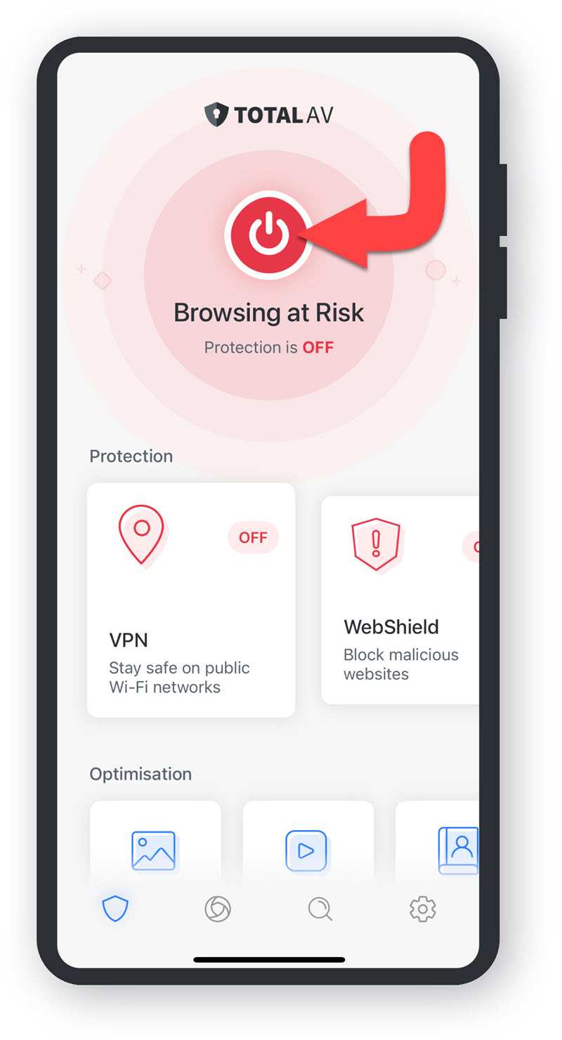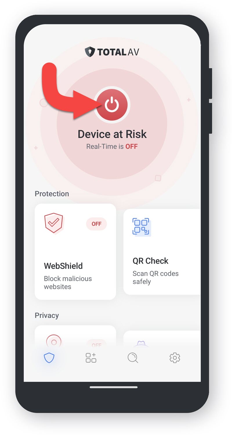 För att aktivera realtidsskyddet TotalAV, tryck på på-knappen .