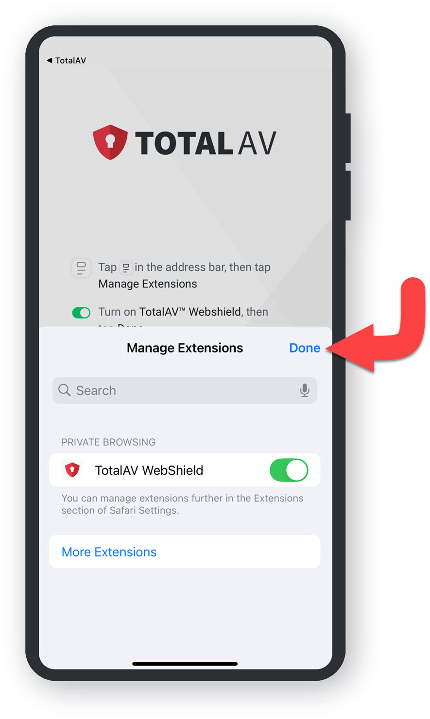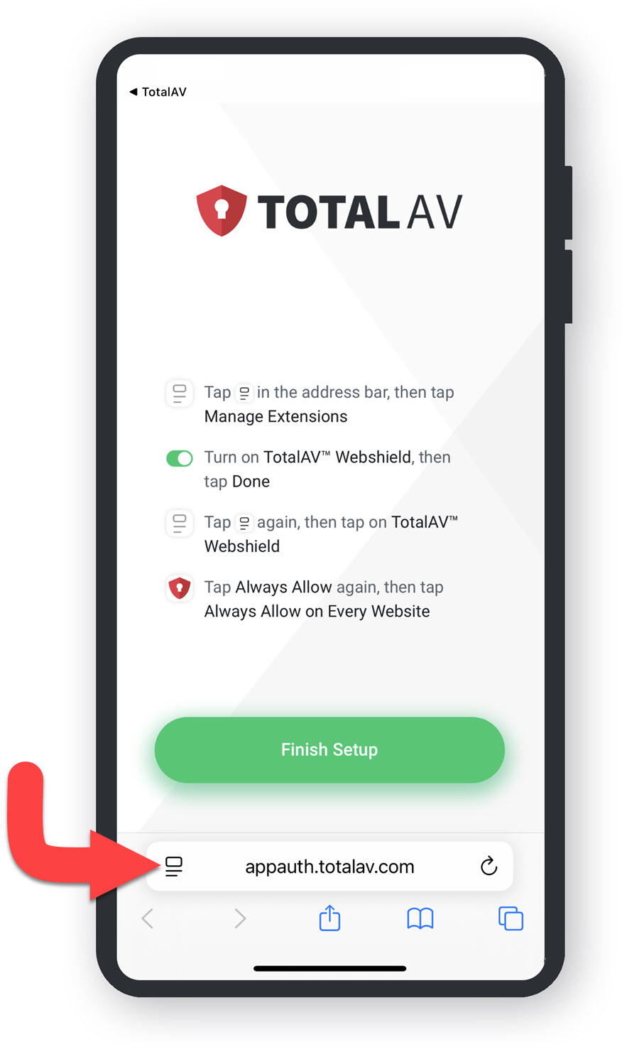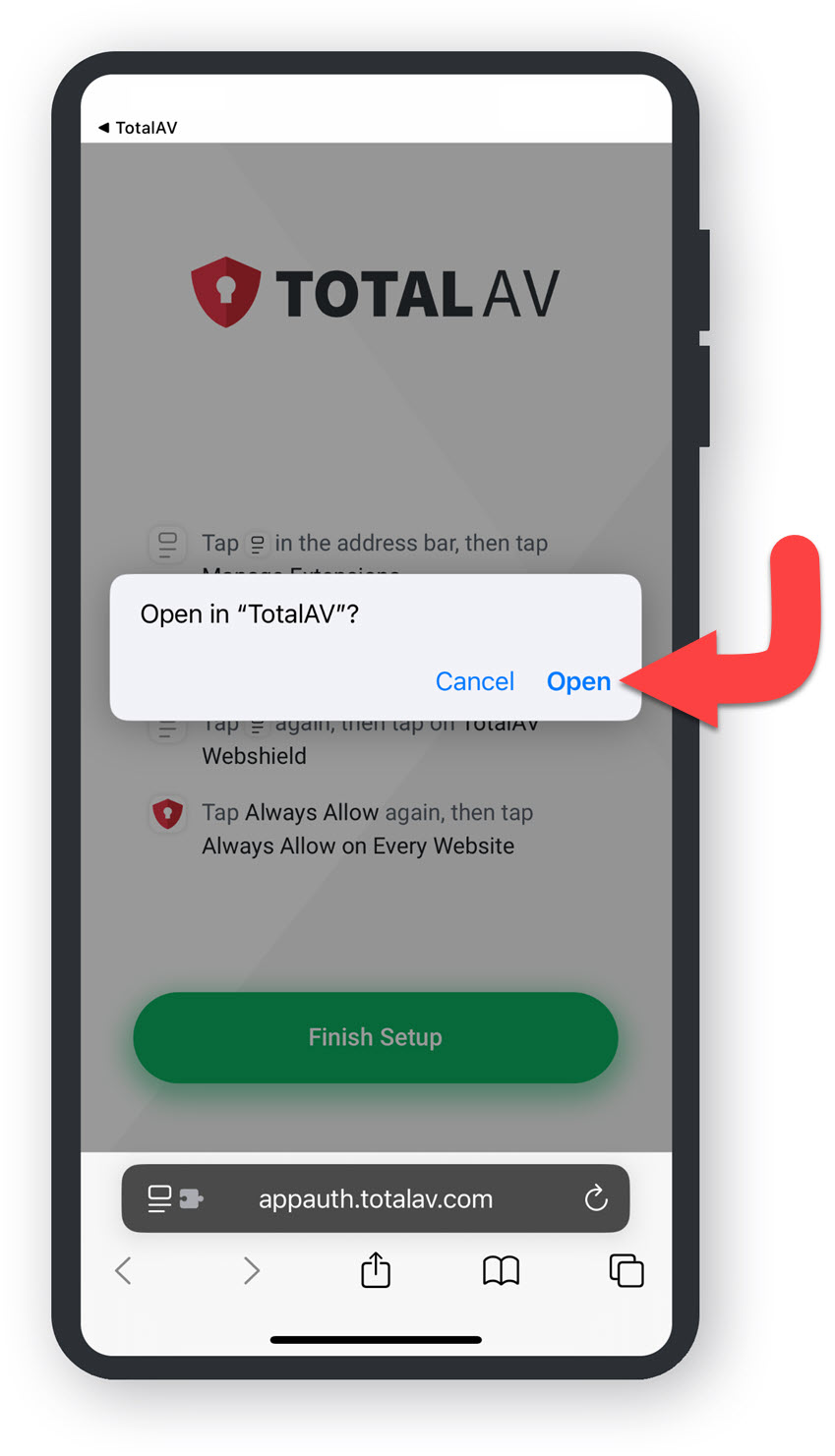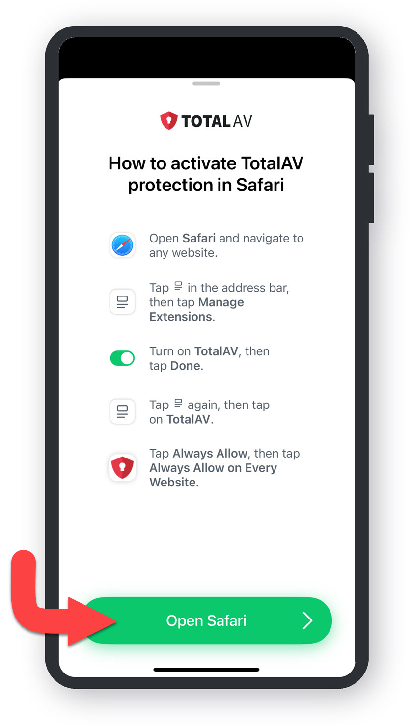 • Ett nytt fönster öppnas med steg för hur du aktiverar TotalAV Webshield, tryck på Öppna Safari för att starta.
