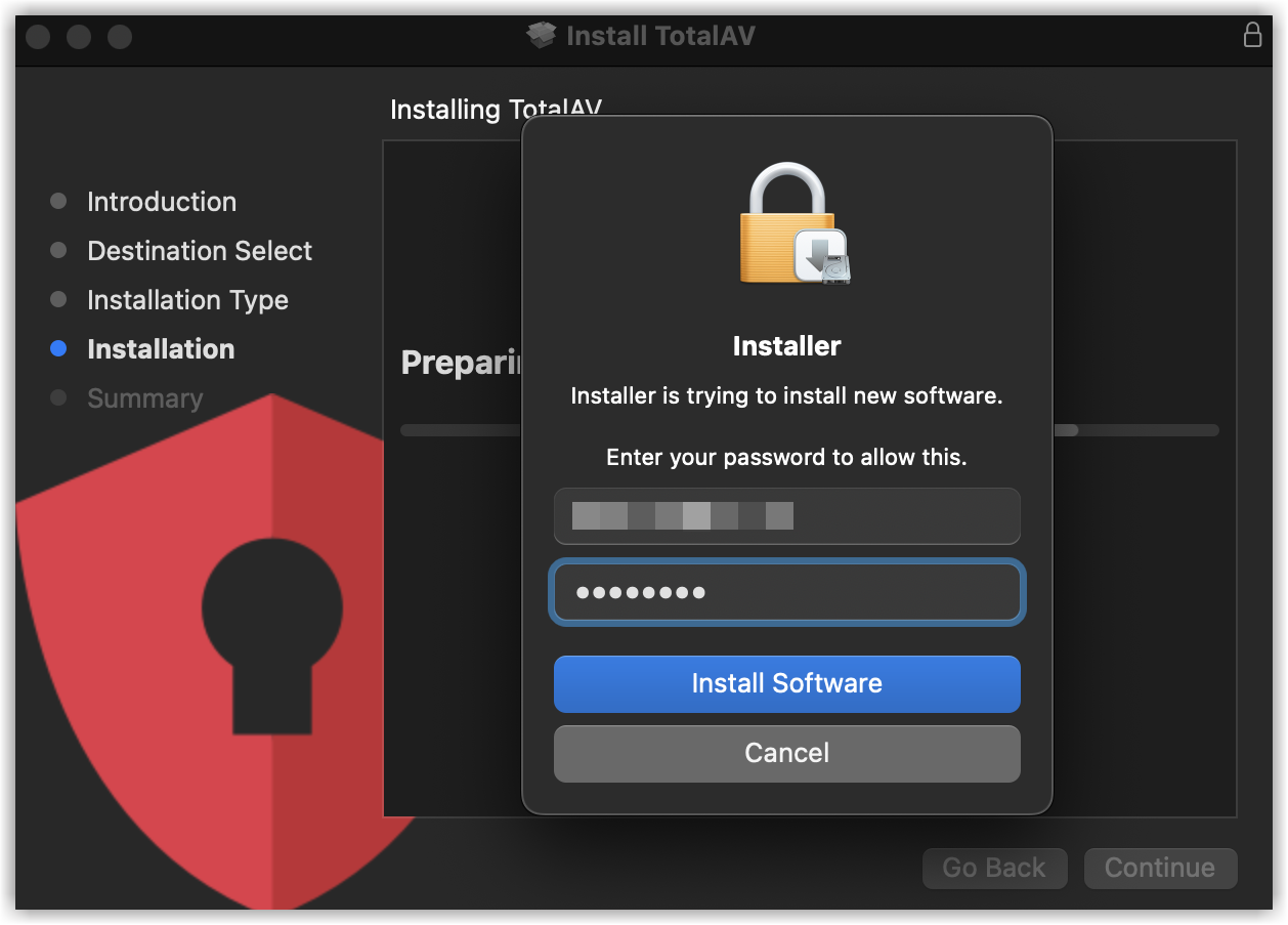 Ange ditt Apple Mac-lösenord och klicka på Installera programvara.