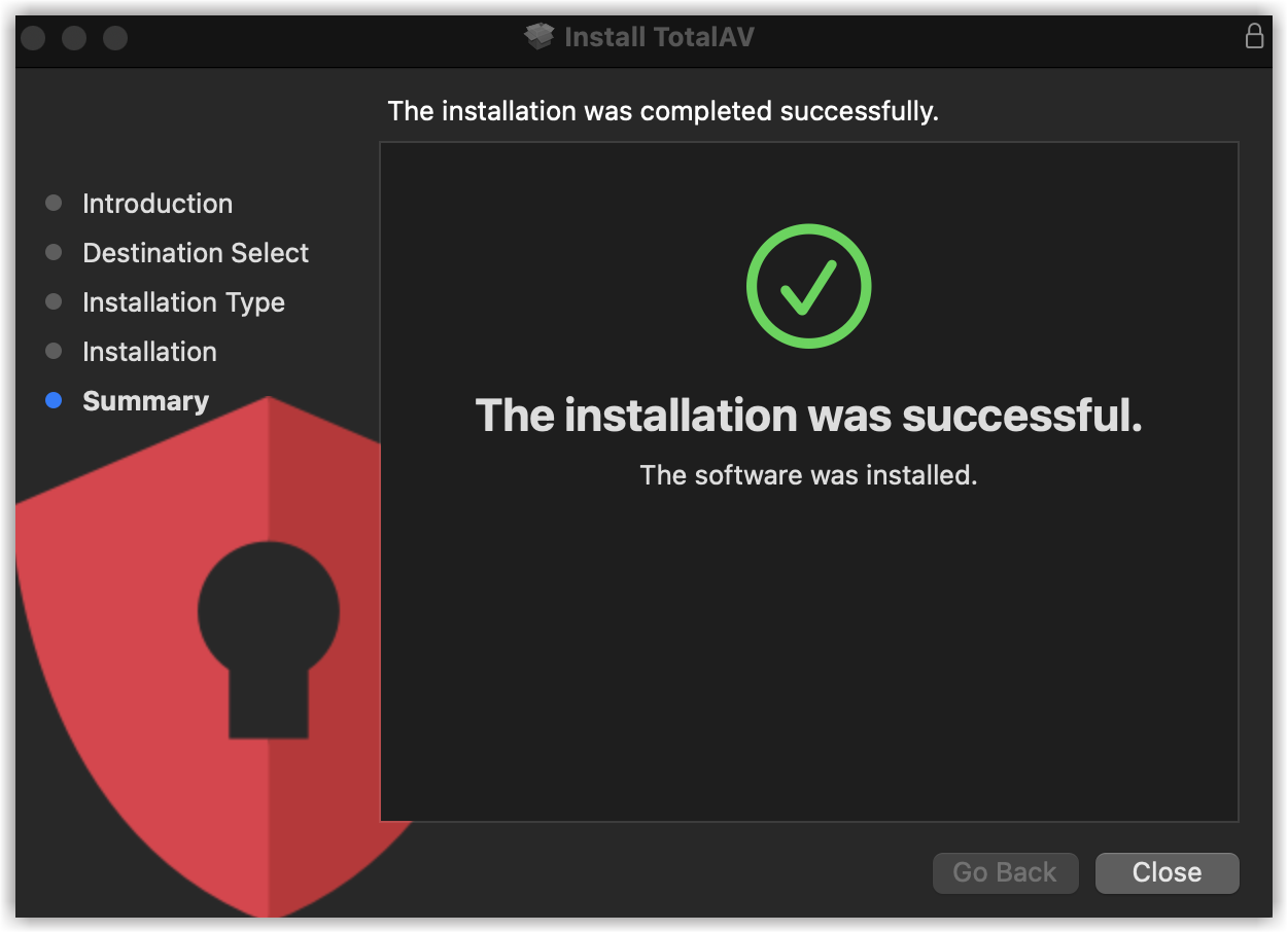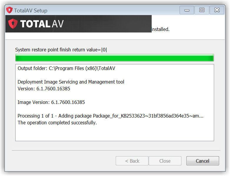 Klicka på Stäng för att fortsätta till TotalAV-applikationen.