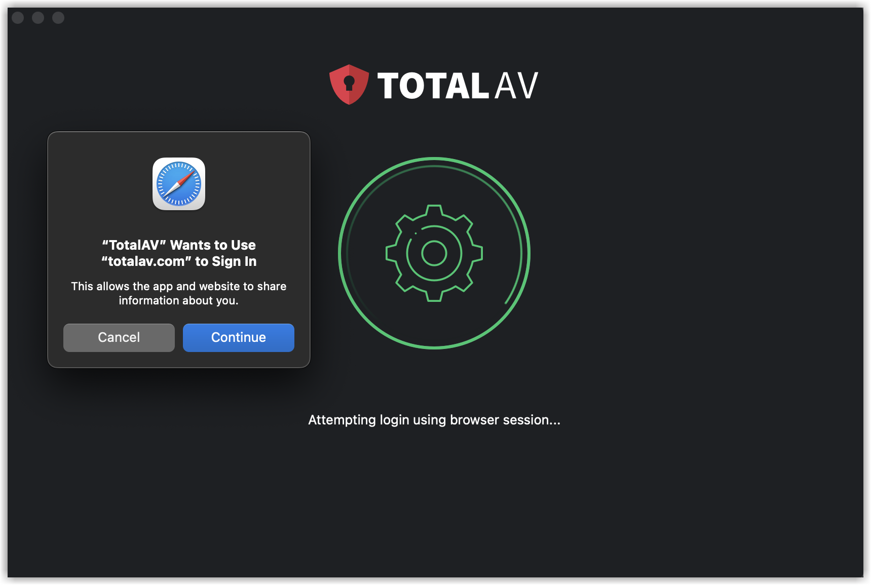TotalAV kommer att försöka logga in med din nuvarande webbläsarsession, vänligen klicka på Fortsätt. Om det misslyckas, följ nästa steg.