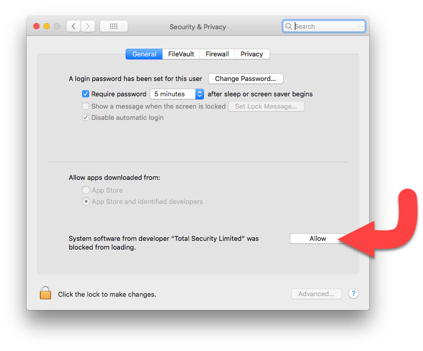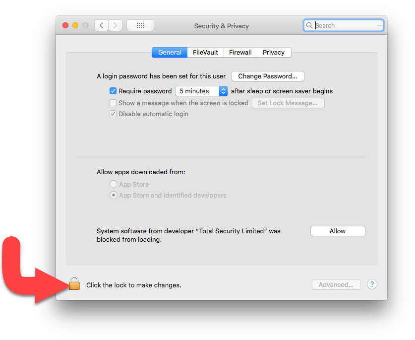 • Klicka på låsikonen för att godkänna de ändringar du ska göra och ange dina Apple Mac-kontouppgifter.