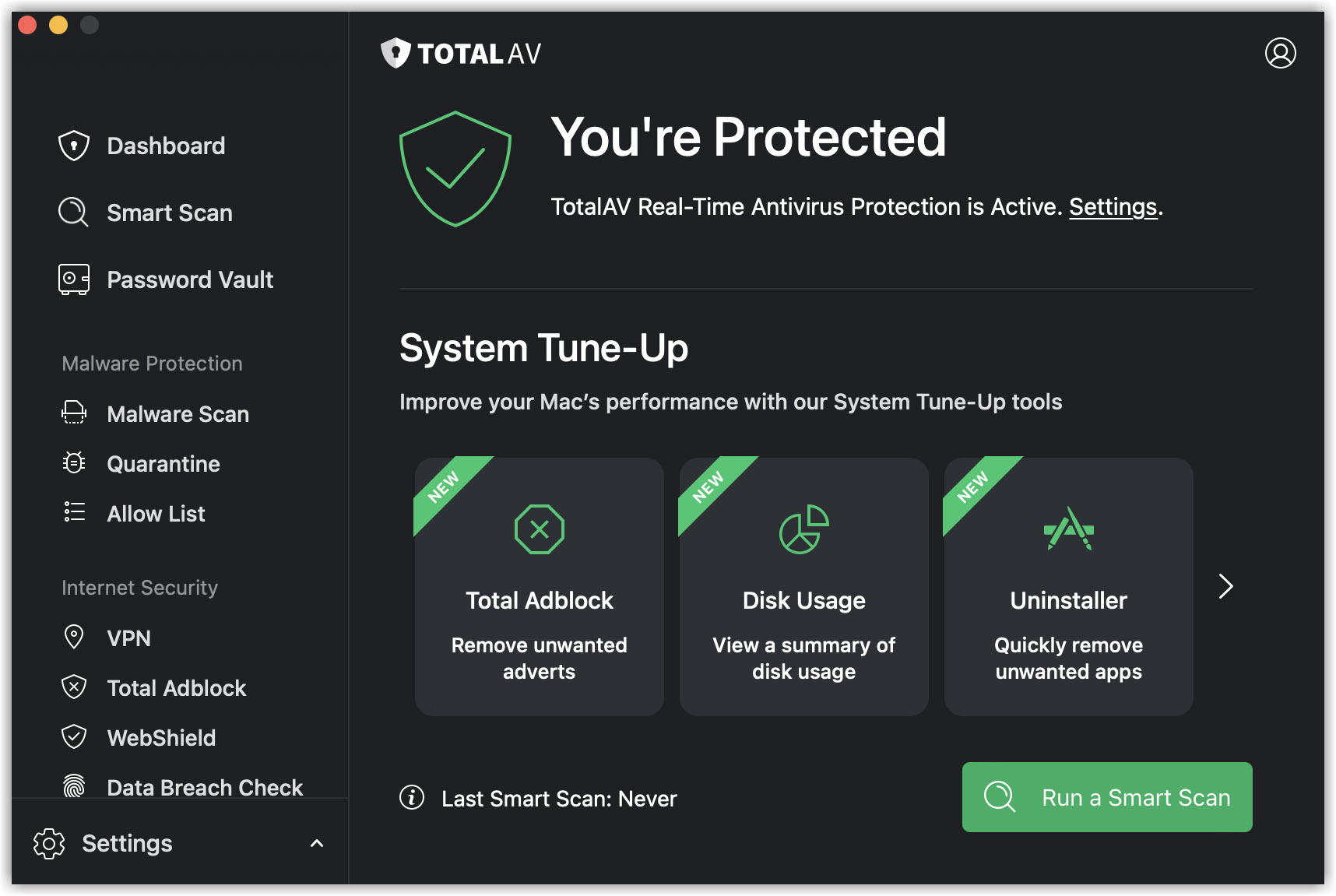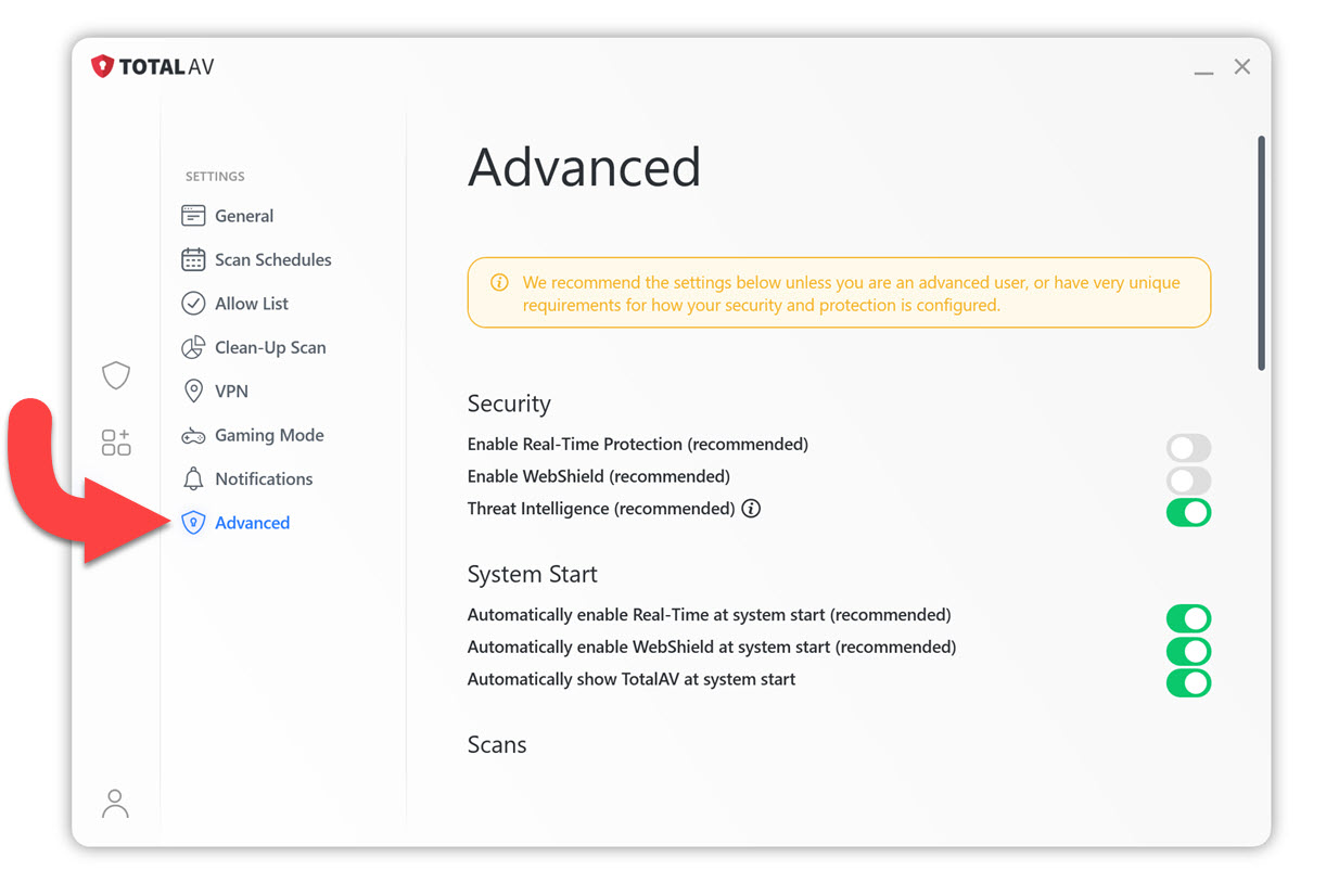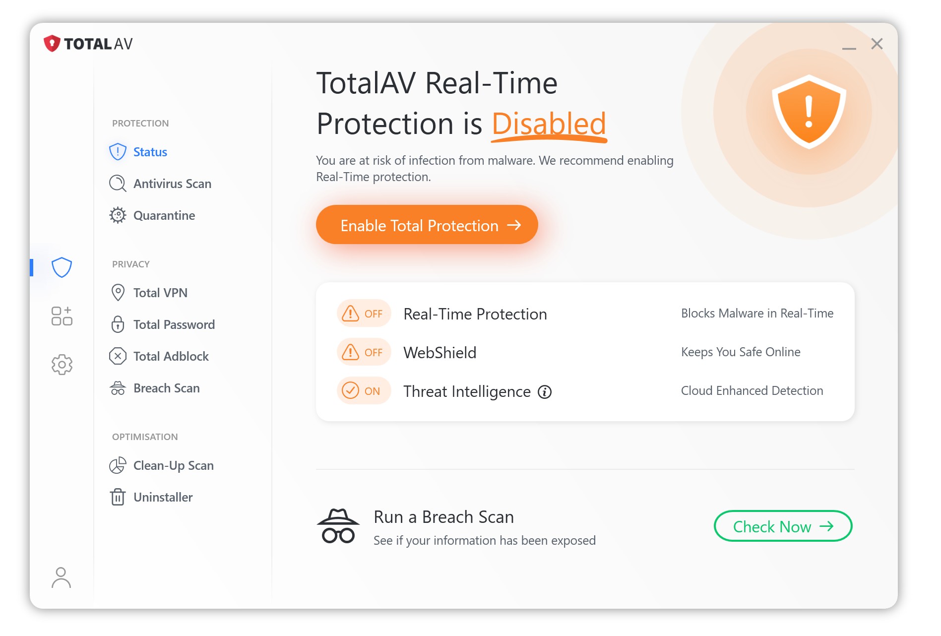 När du har installerat TotalAV måste du aktivera Realtidsskydd för att skydda dig mot hot i realtid.
